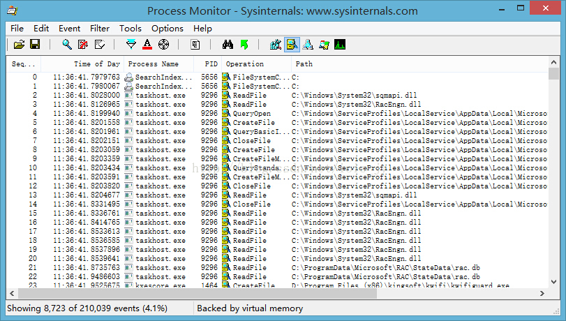 Process Monitor会显示Windows文件系统的所有活动信息,包括本地的存储文件以及远程文件系统。Process Monitor能够自动侦测到新加入的文件系统设备并且对其进行监控。当一个文件系统开始运行后,与用户会话相关的所有文件系统路径都会被显示出来。举例来说,如果用户A将Z盘设置为了共享,那么所有使用这个共享的用户都会因为与Z盘建立了关系,而显示在Process Monitor中。