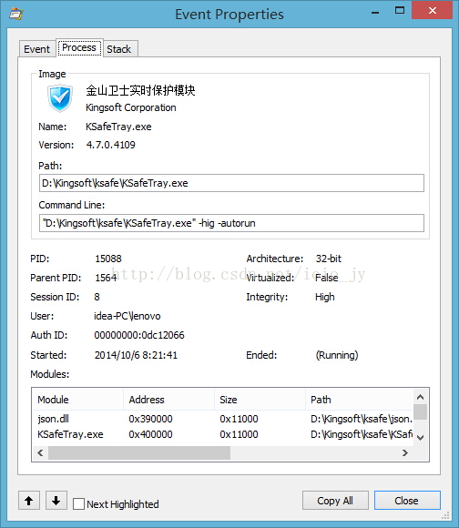 进程页的底部区域显示了当事件执行时,由该进程读取的映像列表,以及读取的地址。双击列表中的一个映像可以查看关于映像的更多信息,包括它的版本信息等。