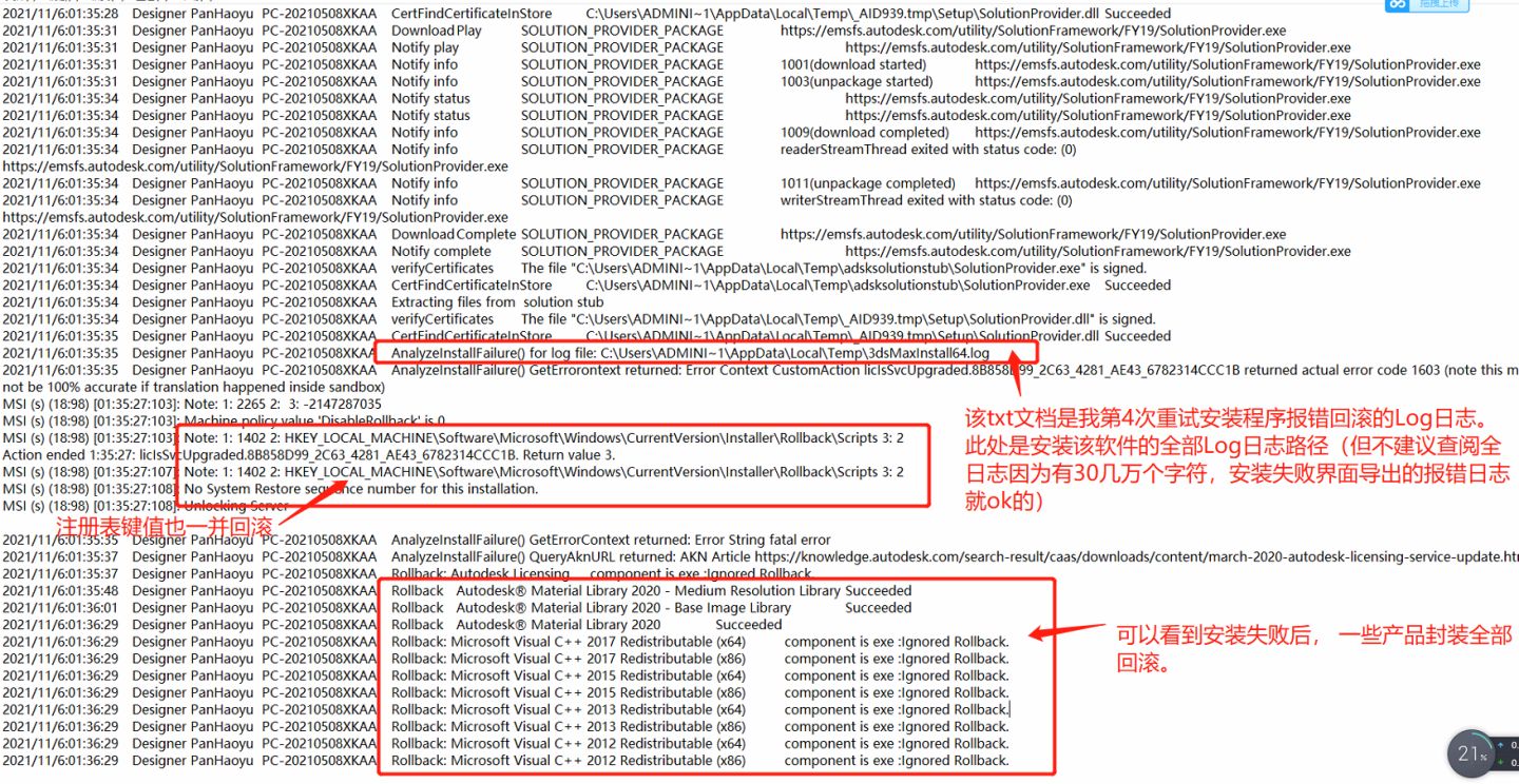 完成后,继续重试安装时再次回滚了哭哭,安装日志一探究竟。控制面板卸载3dmax在安装过程中报错的“Microsoft Visual C++ 20XX”等版本的系统程序(对照安装报错log日志txt文档确定)。