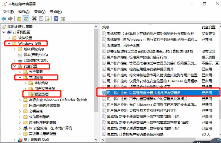 在组策略左侧依次展开:计算机配置→Windows设置→安全设置→本地策略→安全选项;