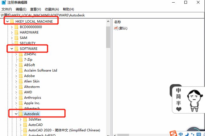 3.第3个位置:在这以全部删除为例,也可根据需要删除Autodesk节点层级下的相关软件。找到HKEY_LOCAL_MACHINESOFTWAREAutodesk,把这个表层级节点下的Autodesk相关文件、文件夹全部删除。