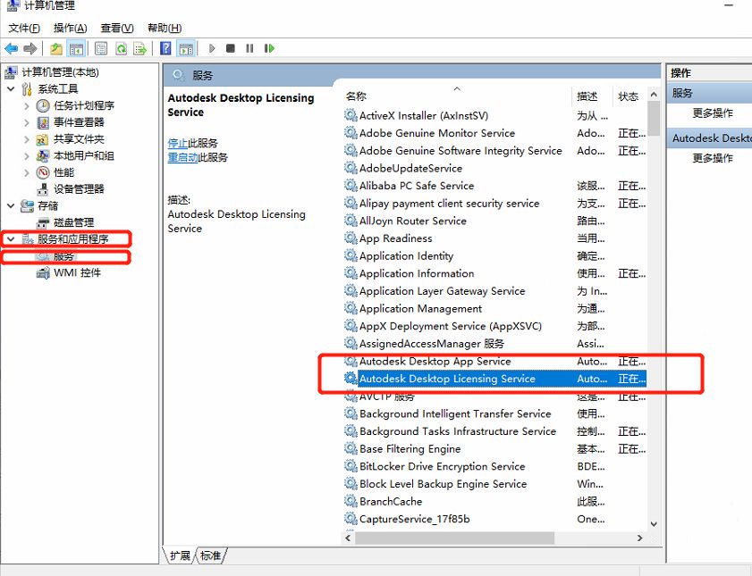 或win+x——计算机管理——服务和应用程序——服务。查看服务有无auto公司程序正在运行。如果有双击Autodesk Desktop Licensing Servies——常规选项卡下单击“停止”——登陆选项卡下单击“本地系统账户”应用——常规选项卡下单击“启动”。
