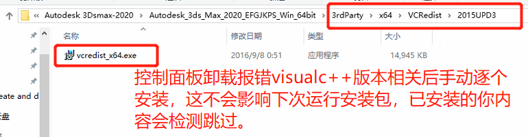 Max安装程序安装失败,因此我们现在进行手动安装:找到解压后安装包路径:解压安装包3rdPartyx64VCRedist。分别手动安装86位和64。