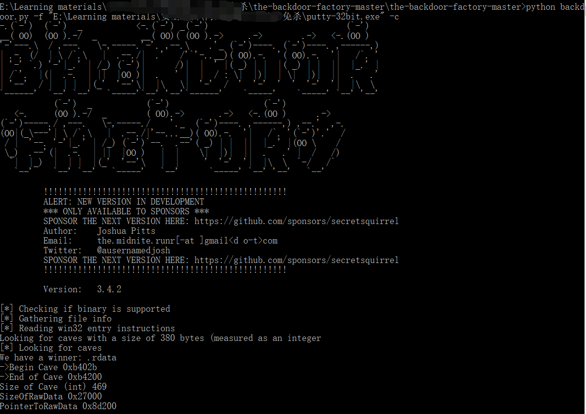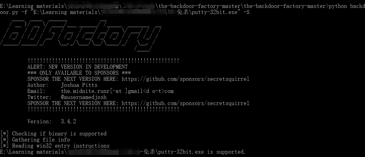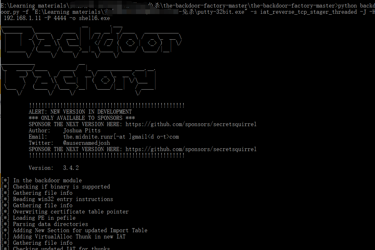 backdoor-factory,又称后门工厂(BFD),BFD也是一款老牌的免杀神器,其作者曾经在2015年的blackhat大会上介绍过该工具,但是作者已经于2017年停止更新,免杀效果至今还算是不错。