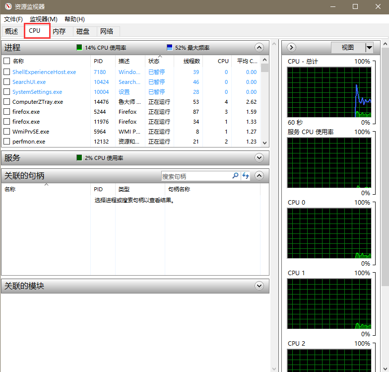 ②点击上方的“性能”——点击下方的“打开资源监视器”——点击“CPU”