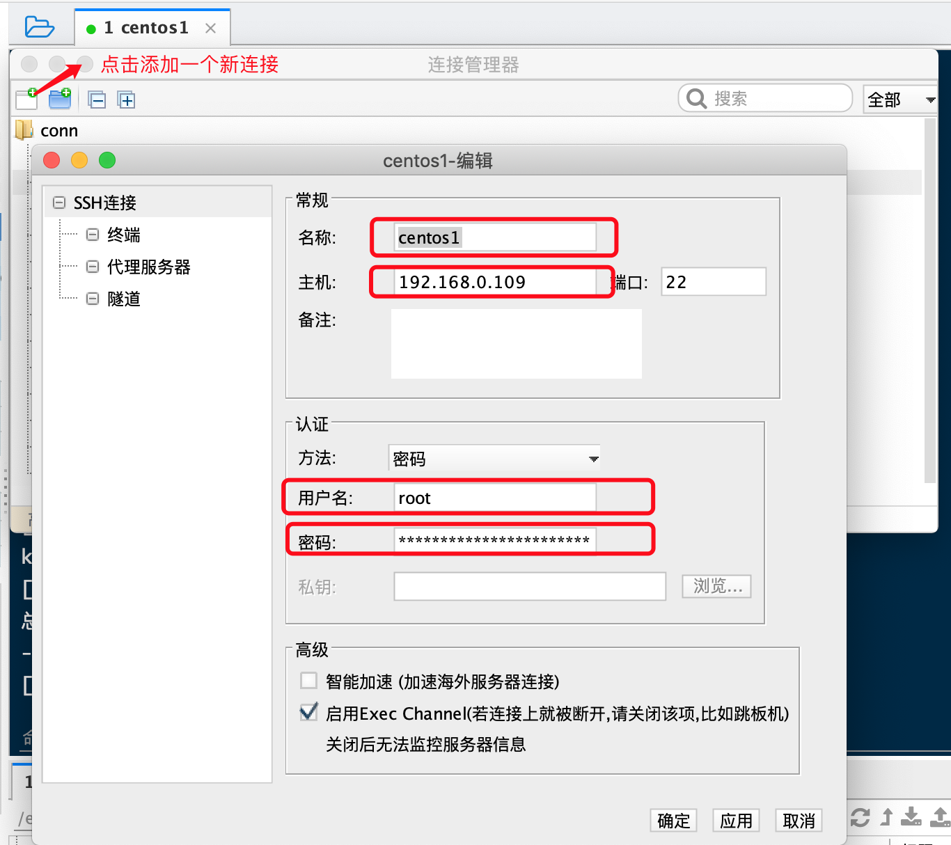 4、打开FinalShell添加新连接,并填入对应主机名、主机IP、账号、密码,端口号22一般不用更改;