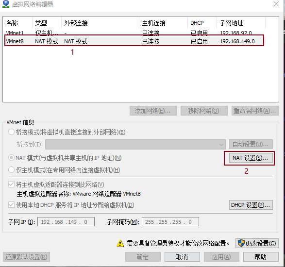 2、选择VMnet8 ,点“NAT设置”
