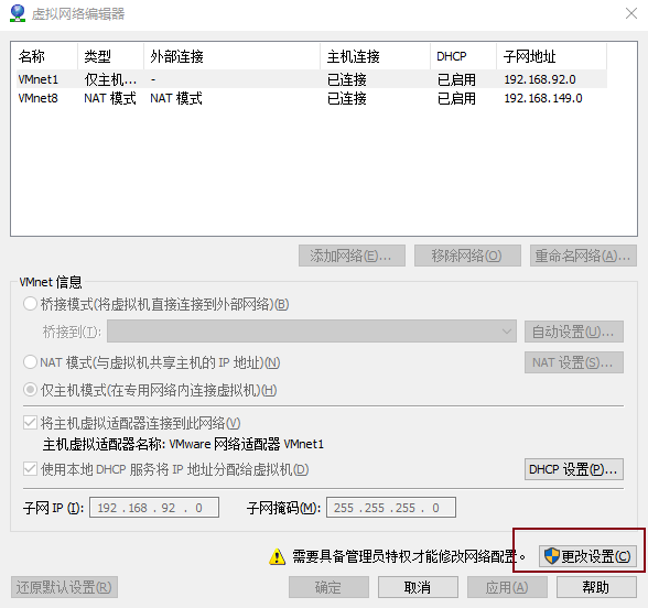 1、"编辑: -> "虚拟网络编辑器"(先关闭所有虚拟机运行的主机),点击“更改设置”。