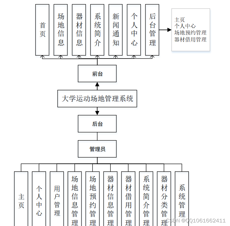 (a) 管理员:管理员使用本系统涉到的功能主要有主页、个人中心、用户管理、场地信息管理、场地预约管理、器材信息管理、器材借用管理、系统简介管理、器材分类管理、系统管理等功能。