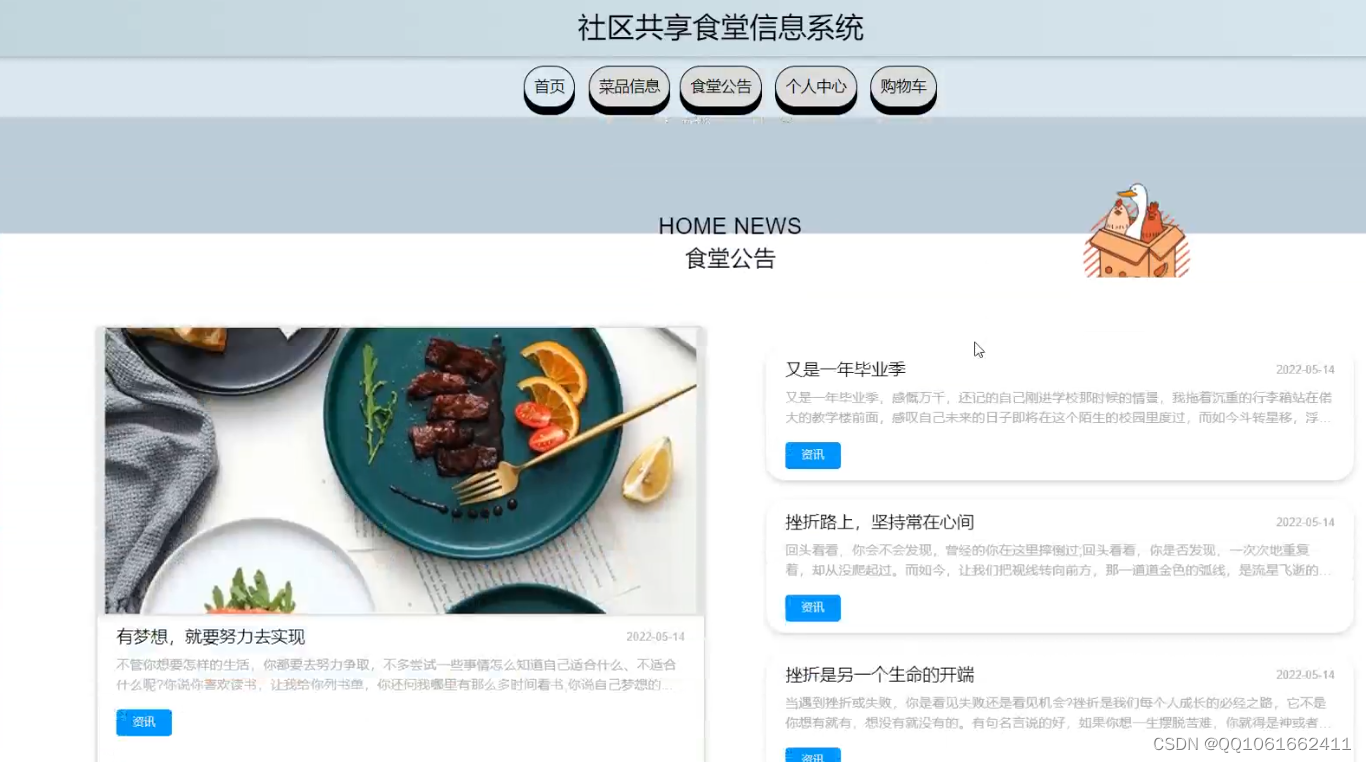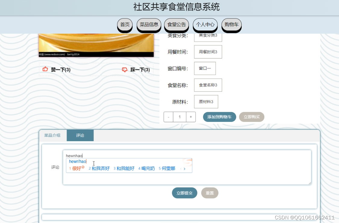 ;2;在用户模块中,可以实现首页、菜品信息、食堂公告、个人中心、购物车等功能。