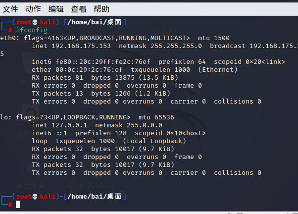 2.设置kali 的IP地址为自动获取,查看kali IP地址:ifconfig