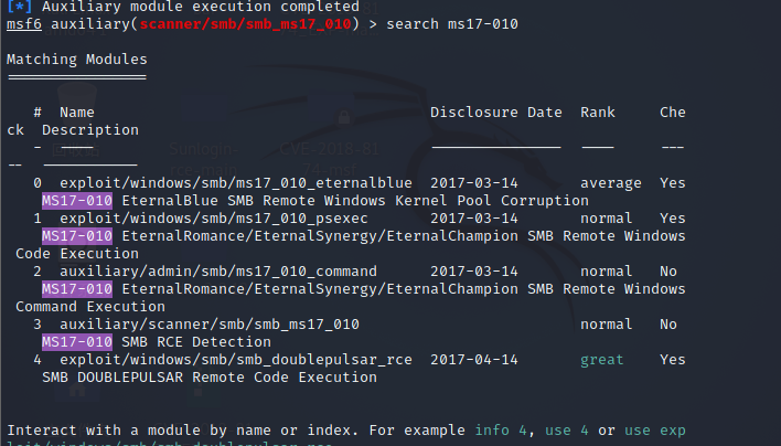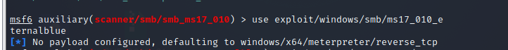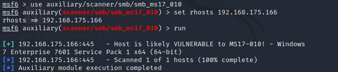 扫描命令:use auxiliary/scanner/smb/smb_ms17_010