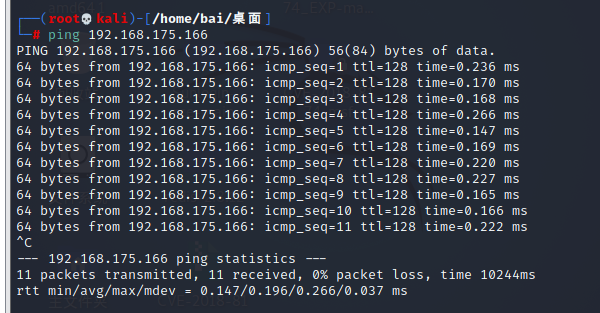 1.测试两台主机的连通性:用kali 去Ping windows 7的主机,来测试连通性