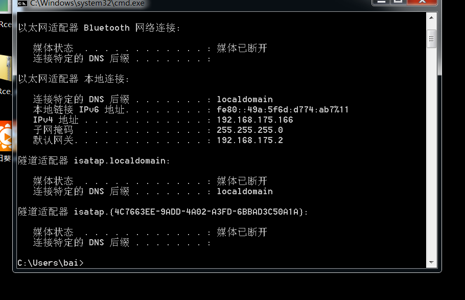 3.设置windows 7的IP地址为自动获取,查看windows 7的IP地址:ipconfig