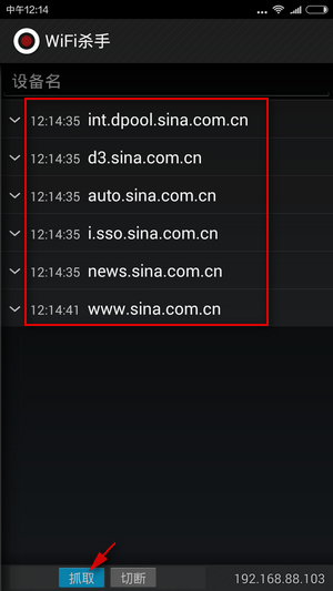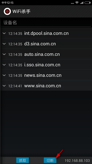 ③ WiFi Kill会收集到所有接入本SSID的设备,包括手机和笔记本电脑;这里我们选择192.168.88.103进行操作(当然也可以一次操作所有的IP);