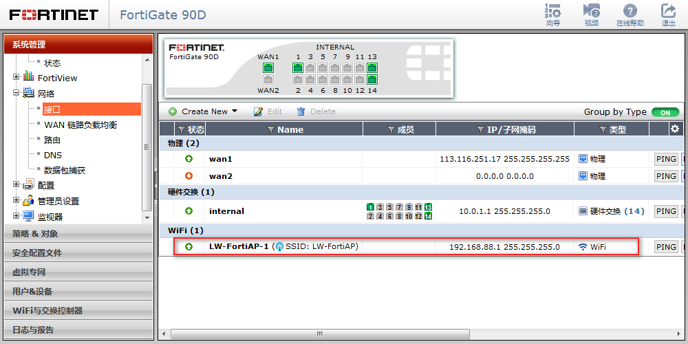 ① 首先了解FortiAP接口名为LW-FortiAP-1,WiFi的网关为192.168.88.1。