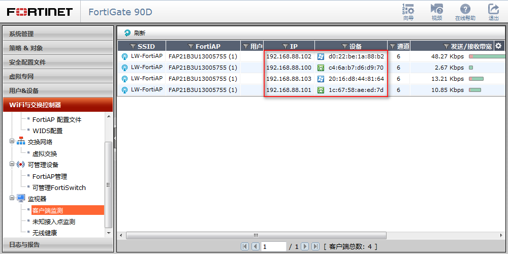 ② 可以通过客户端监测,查看到FortiAP连接了多少设备,以及每个设备的IP地址和MAC地址;