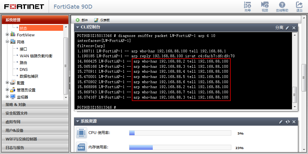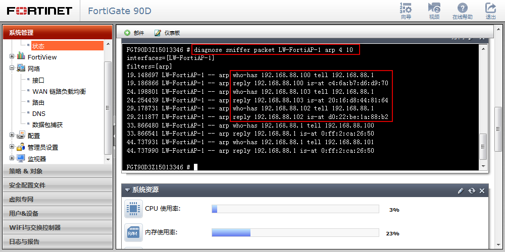 ③ 在防火墙的命令模式下,通过抓包命令 diagnose sniffer packet LW-FortiAP-1 arp 4 10 查看FortiAP的ARP的更新情况,可以看到所有设备上网的发送网关都是192.168.88.1,每个IP与MAC地址也是一至的。