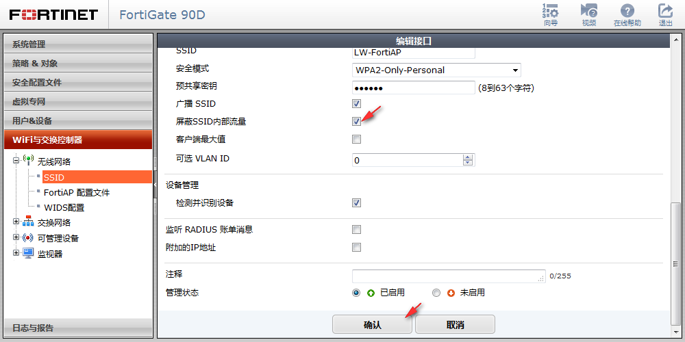 ① 在防火墙菜单上选择【WiFi与交换控制器】-【无线网络】-【SSID】,选择LW-FortiAP-1,点击编辑;