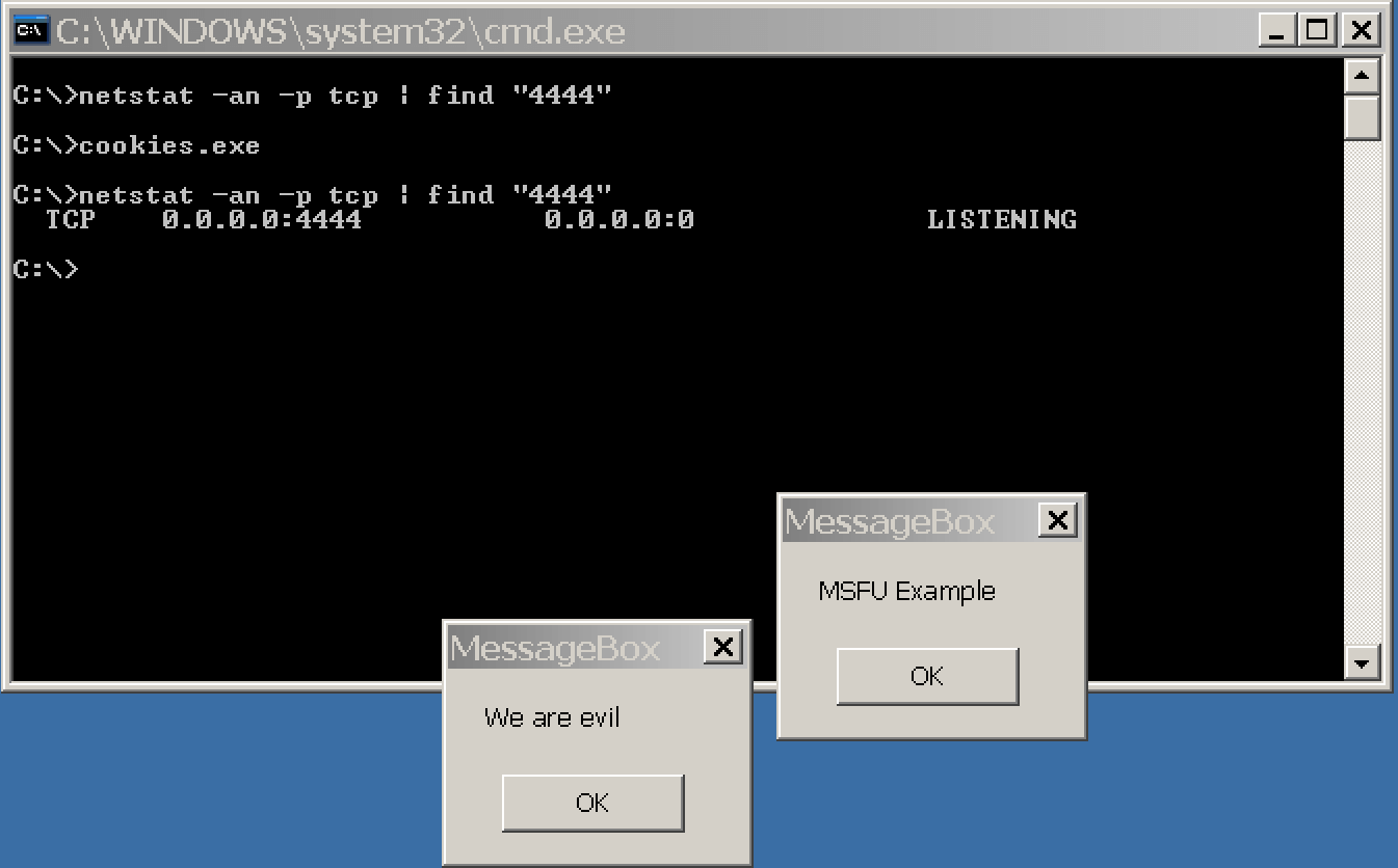 运行cookies.exe文件将使用默认设置(端口4444)执行消息框有效负载以及绑定shell。