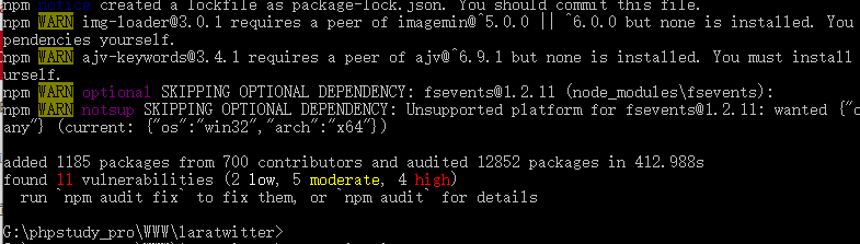 | 1. 运行npm install 时总出现'added 1185 packages from 700 contributors and audited 12852 packages in 412.988s