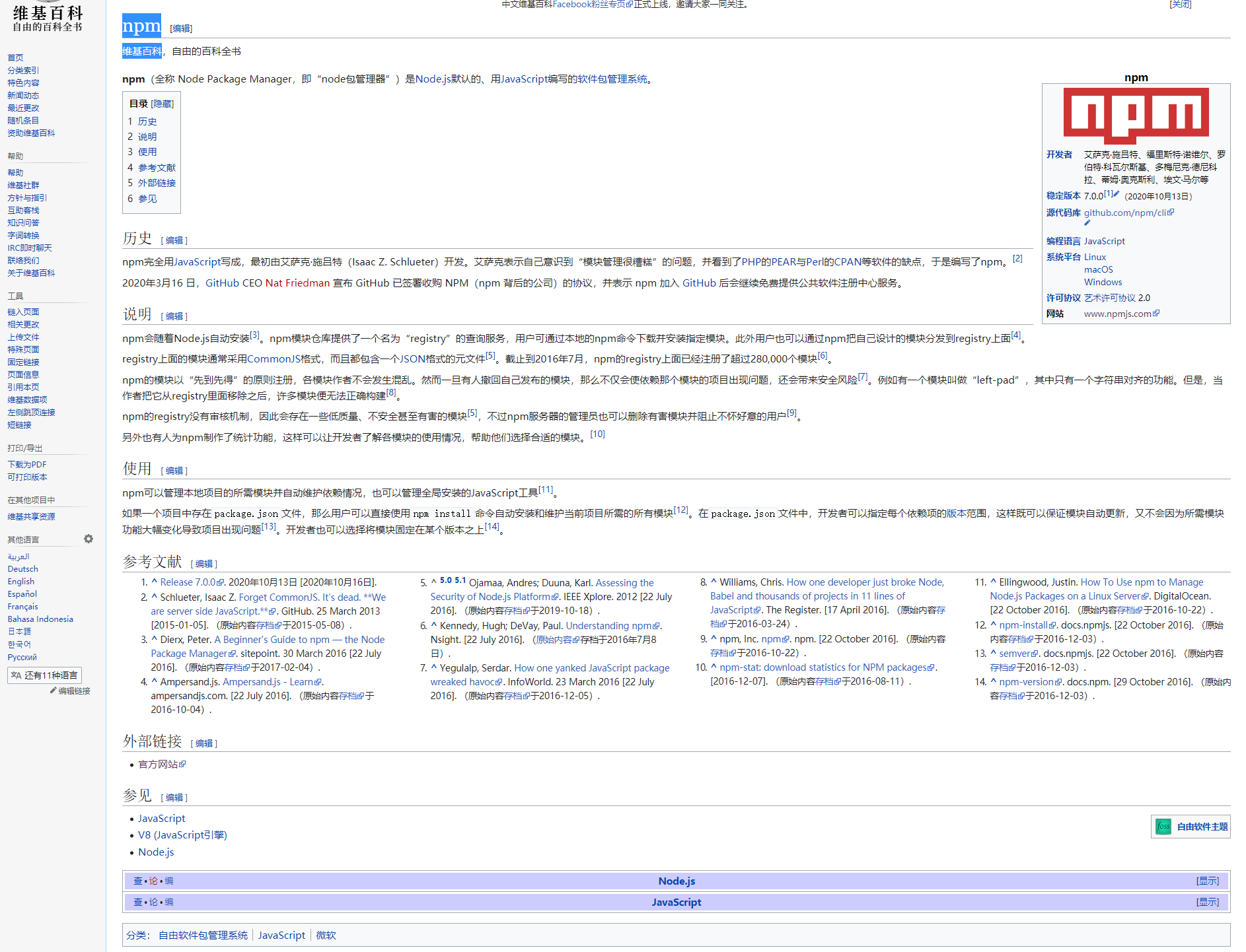 1 介绍 参见: https://docs.npmjs.com/ // 推荐 runoob.com/nodejs/nodejs-npm.html https://zh.wikipedia.org/zh-hans/Npm // 维基百科 - npm