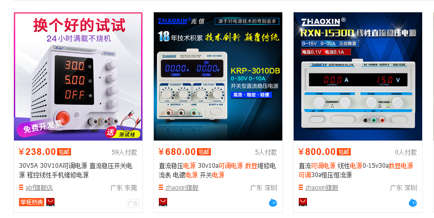 但是,都有些许问题困扰。一是基于适用性和成本考虑,这里讲的适用性就是我们大多数使用时的电压范围,电流范围。这里我们用淘宝来搜索“电源模块 可调电源”。销量第一的是