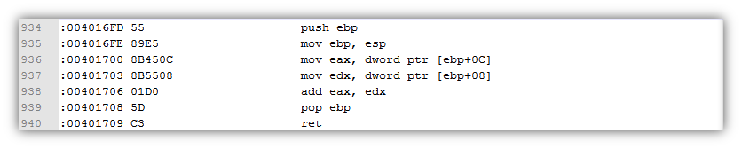 上面分别是"内存地址|机器码|对应的汇编语句",可以看到call调用了0X004016FD地址处的myadd加法函数;该函数具体实现如下图所示:
