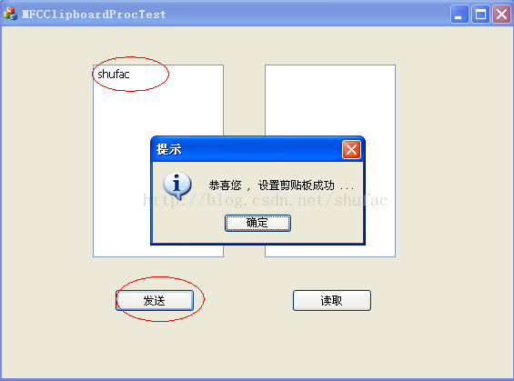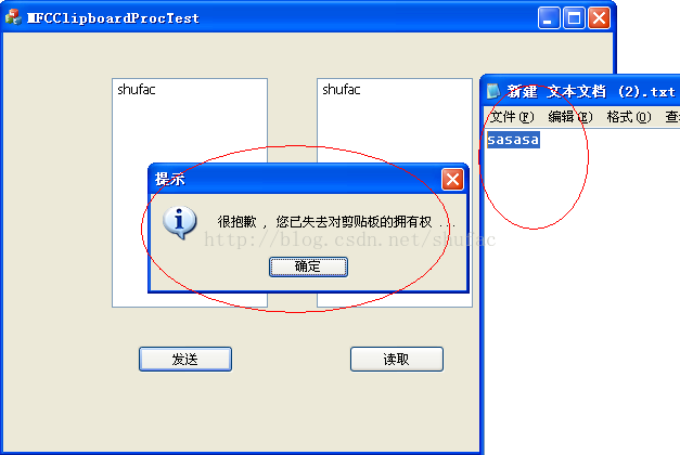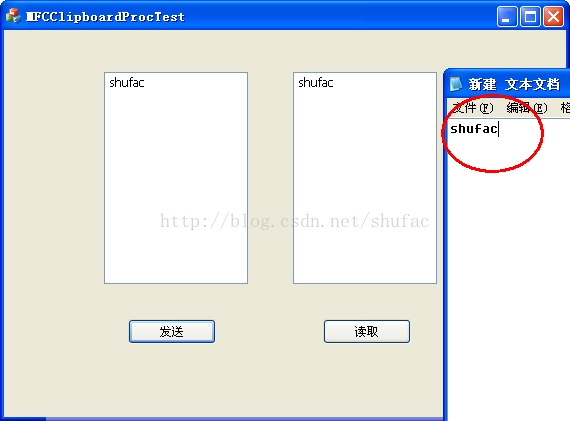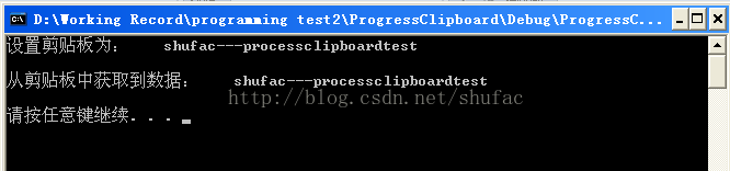 注:程序运行后,剪贴板上的内容“shufac---processclipboardtest”,可以打开一个文本文件,粘贴剪贴板上的内容,验证一下。