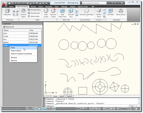 When you want to use these clipboard entries, you simply right-click on one and choose the appropriate paste option (which ultimately just calls through to the standard AutoCAD paste commands, PASTECLIP, PASTEBLOCK and PASTEORIG, reducing the complexity of the tool).