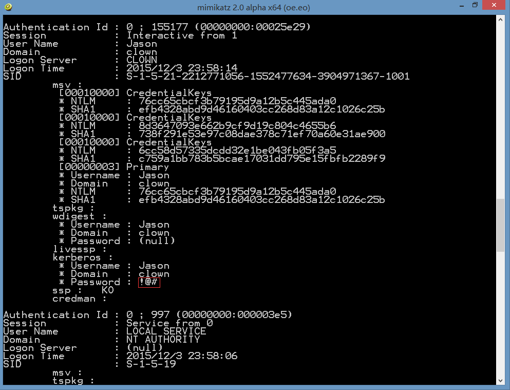 然后输入sekurlsa::logonpasswords来获取密码。没错的话是下面这样
