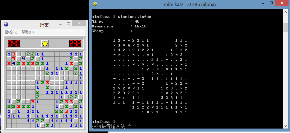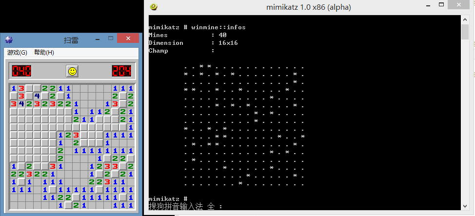 因为mimikatz其实可以读取内存,所以和windows密码相关的sam文件开机在内存中,也所以mimikatz可以从内存中的sam文件中获取出windows明文密码,而我现在要说的就是扫雷。很多人喜欢玩扫雷,其实mimikatz可以通过一条命令就读取出扫雷游戏中地雷的位置,可以轻松的玩游戏。经过测试,这个在1.0版本中才可以正常读取,2.0是不行的,或者也可能是使用的方法是不一样的。