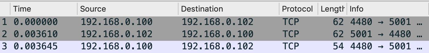 1.Draw a diagram to illustrate the handshake between 192.168.0.100:4480 and 192.168.0.102:5001. List the length of the all packets used to complete TCP handshake.