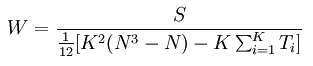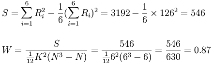 - mi为第i个评价者的评定结果中有重复等级的个数。