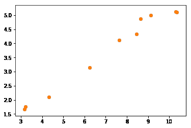 correlation 0.989176319869 pvalue 5.92687594648e-08import matplotlib.pyplot as plt plt.scatter(x,y) plt.show()