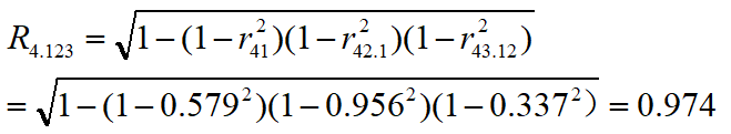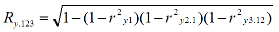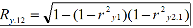 - 偏相关系数的绝对值必小于或最多等于由同一系列资料所求得的复相关系数,即 R1·23≥|r12·3|