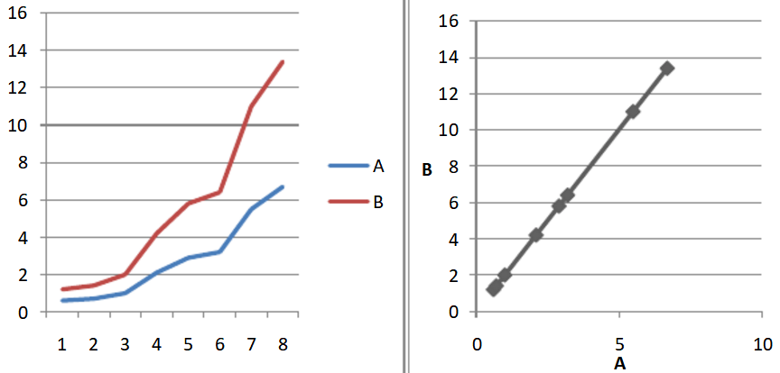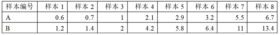 先来看一个小实验,两个基因A、B,他们的表达量关系是B=2A,在8个样本中的表达量值如下: