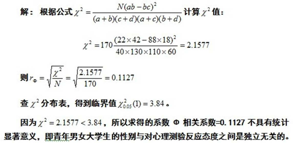 为了研究青年大学生对性别与对心里测验态度的关系,选取了170名青年进行心里测验,计算性别对测验态度的φ相关系数