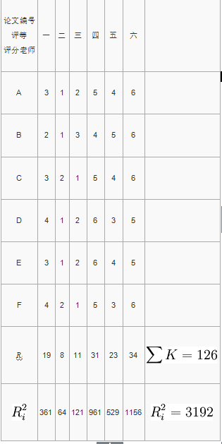 由于每个评分老师对6篇论文的评定都无相同的等级: