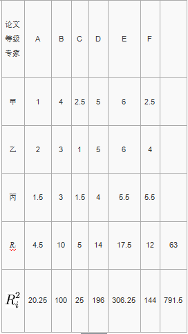 3名专家对6篇心理学论文的评分经等级转换如下表所示,试计算专家评定结果的肯德尔和谐系数