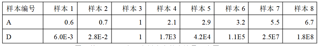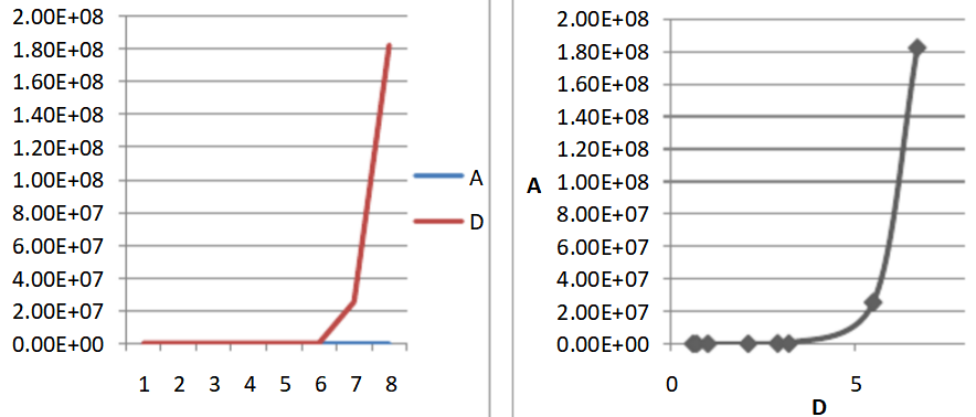 两个基因A、D,他们的关系是D=A^10,在8个样本中的表达量值如下: