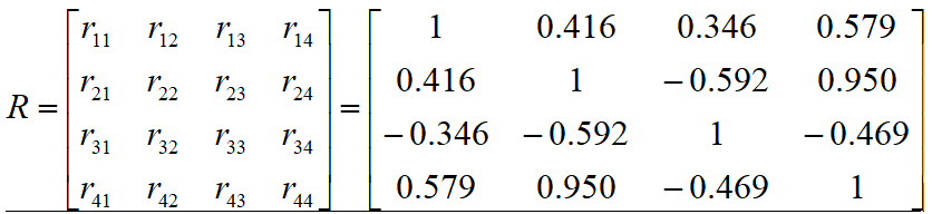 对于某四个地理要素x1,x2,x3,x4的23个样本数据,经过计算得到了如下的单相关系数矩阵: