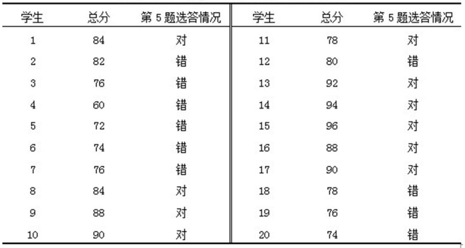 有50道选择题,每题2分,有20人的总成绩和第五题的情况,第五题与总分的相关程度如何。